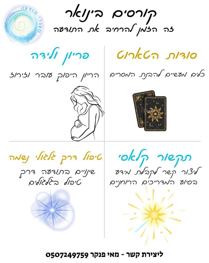 שלום רב, שמי מאי פנקר ואני מייסדת שיטת "מעגל תודעה" לשינוי תודעתי ואני מטפלת רב תחומית למעלה מ30 שנה. טיפולים כגון B.p.m, רייקי ברמת סייקס, כוסות רוח ונרות הופי.